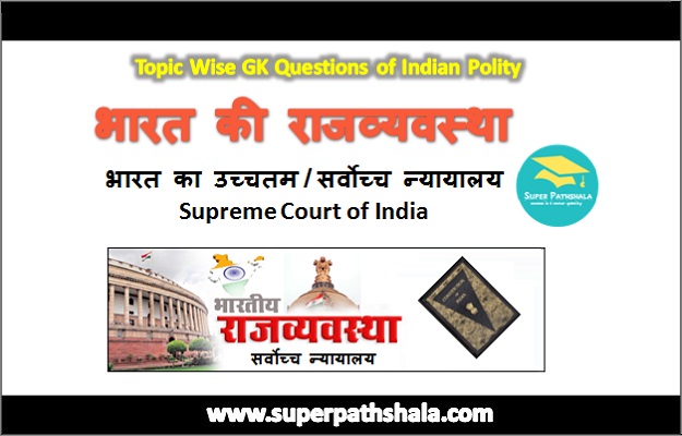 Supreme Court of India [भारत का उच्चतम / सर्वोच्च न्यायालय] is very important topic of Indian Polity / Indian Constituion (भारतीय राजव्यवस्था / भारतीय संविधान ) in the exam point of view. We are going to share the set of 20 Multiple Choice Questions in this post. Complete the all practice set of this topic that are provided by Super Pathshala. GK questions of this post "सर्वोच्च न्यायालय GK Questions SET 5" are very helpful for various government exams e.g. UPSC, SSC, Railway, Banking, State PSC, CDS, NDA, SSC CGL, SSC CHSL, Patwari, Samvida, Police, SI, CTET, TET, Army, MAT, CLAT, NIFT, IBPS PO, IBPS Clerk, CET, Vyapam etc. General Knowledge or Samanya Gyan is very important section to crack any exam. In this section we are providing GK in Hindi and GK Questions in English in another section. These Online Quiz contain the previous year asked questions in various govt exams, so practice these Online GK Test in Hindi at least one set of each subject daily. Get also all other subjects GK Questions and Answers in MCQ format from Super Pathshala.