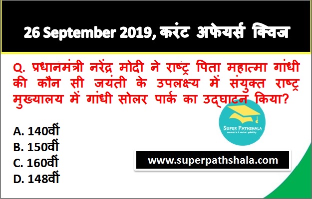 | Q10. | प्रधानमंत्री नरेंद्र मोदी ने राष्ट्र पिता महात्मा गांधी की कौन सी जयंती के उपलक्ष्य में संयुक्त राष्ट्र मुख्यालय में गांधी सोलर पार्क का उद्घाटन किया? |