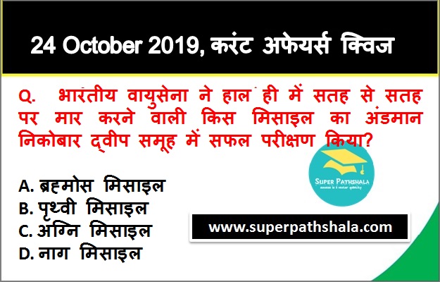 | Q1. | भारतीय वायुसेना ने हाल ही में सतह से सतह पर मार करने वाली किस मिसाइल का अंडमान निकोबार द्वीप समूह में सफल परीक्षण किया? |