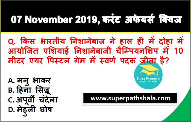 | Q2. | किस भारतीय निशानेबाज ने हाल ही में दोहा में आयोजित एशियाई निशानेबाजी चैम्पियनशिप में 10 मीटर एयर पिस्टल गेम में स्वर्ण पदक जीता है? |
