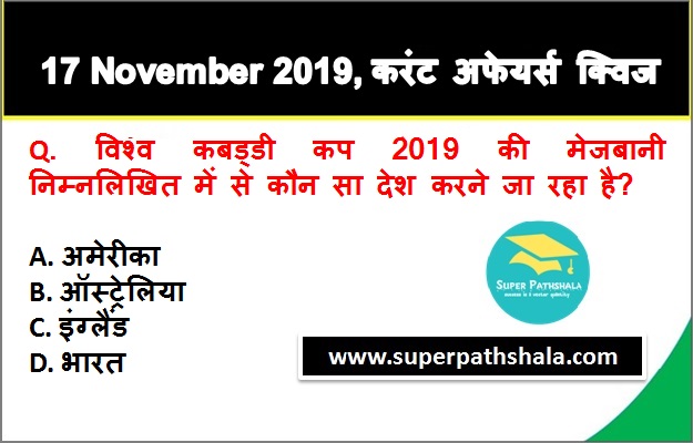 | Q1. | विश्व कबड्डी कप 2019 की मेजबानी निम्नलिखित में से कौन सा देश करने जा रहा है? |