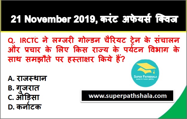 | Q1. | IRCTC ने लग्जरी गोल्डन चैरियट ट्रेन के संचालन और प्रचार के लिए किस राज्य के पर्यटन विभाग के साथ समझौते पर हस्ताक्षर किये हैं? |