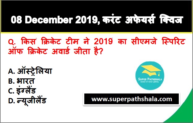 | Q4. | किस क्रिकेट टीम ने 2019 का सीएमजे स्पिरिट ऑफ क्रिकेट अवार्ड जीता है? |