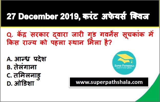 | Q10. | केंद्र सरकार द्वारा जारी गुड गवर्नेंस सूचकांक में किस राज्य को पहला स्थान मिला है? |