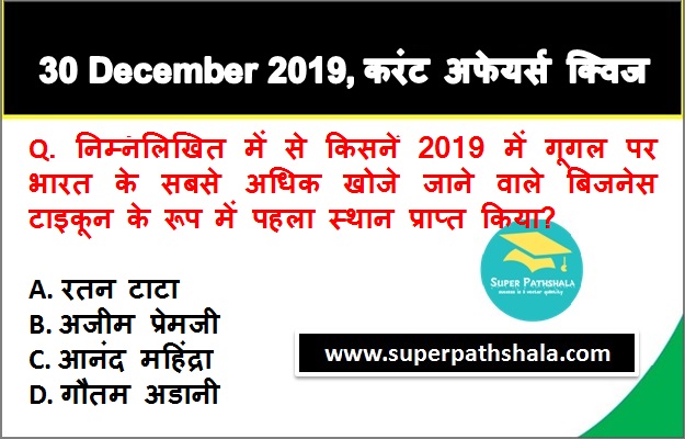 | Q1. | निम्नलिखित में से किसने 2019 में गूगल पर भारत के सबसे अधिक खोजे जाने वाले बिजनेस टाइकून के रूप में पहला स्थान प्राप्त किया? |