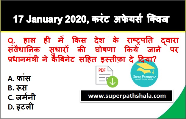 | Q1. | हाल ही में किस देश के राष्ट्रपति द्वारा संवैधानिक सुधारों की घोषणा किये जाने पर प्रधानमंत्री ने कैबिनेट सहित इस्तीफ़ा दे दिया? |