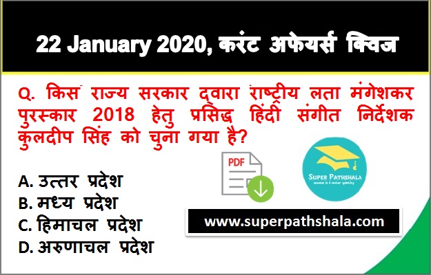 | Q2. | किस राज्य सरकार द्वारा राष्ट्रीय लता मंगेशकर पुरस्कार 2018 हेतु प्रसिद्ध हिंदी संगीत निर्देशक कुलदीप सिंह को चुना गया है? |