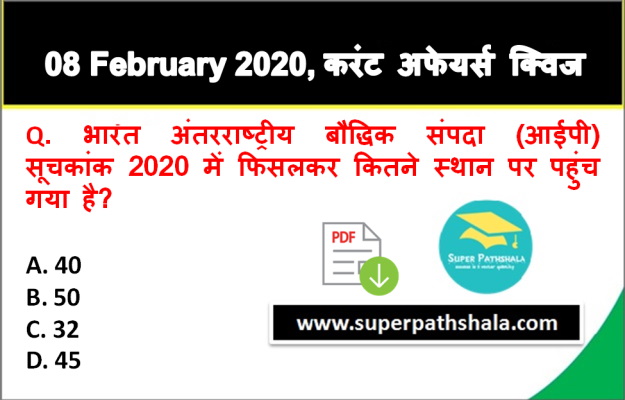 Ans: 40 विवरण: यह जानकारी अमेरिकी चैंबर आफ कॉमर्स के ग्लोबल इनोवेशन पॉलिसी सेंटर की रिपोर्ट में दी गई है. इस सूचकांक में दुनिया की 53 अर्थव्यवस्थाओं में बौद्धिक संपदा परिवेश का आकलन किया जाता है. पिछले साल भारत 50 देशों की इस सूची में 36वें स्थान पर था. बौद्धिक संपदा के मामले में शीर्ष पांच देशों में अमेरिका, ब्रिटेन, स्वीडन, फ्रांस और जर्मनी पिछले साल के अनुरूप कायम हैं. |