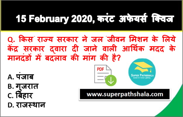 | Q1. | किस राज्य सरकार ने जल जीवन मिशन के लिये केंद्र सरकार द्वारा दी जाने वाली आर्थिक मदद के मानदंडों में बदलाव की मांग की है? |