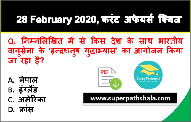 | Q1. | निम्नलिखित में से किस देश के साथ भारतीय वायुसेना के ‘इन्द्रधनुष युद्धाभ्यास’ का आयोजन किया जा रहा है? |