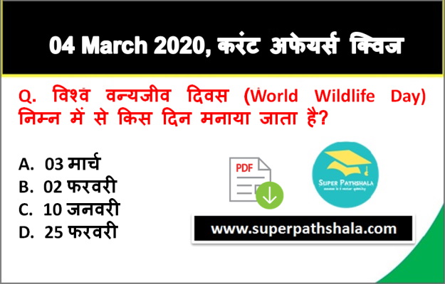 Ans: 03 मार्च विवरण: विश्व वन्यजीव दिवस के रूप में नामित करने का मुख्य उद्देश्य दुनिया के वन्य जीवों एवं वनस्पतियों के बारे में जागरूकता बढ़ाना है. संयुक्त राष्ट्र महासभा ने 20 दिसंबर 2013 को 68वें सत्र में 03 मार्च को विश्व वन्यजीव दिवस घोषित किया था. तीन मार्च को विलुप्तप्राय वन्यजीव और वनस्पति के व्यापार पर अंतर्राष्ट्रीय सम्मेलन को स्वीकृत किया गया था. |