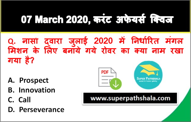 | Q7. | नासा द्वारा जुलाई 2020 में निर्धारित मंगल मिशन के लिए बनाये गये रोवर का क्या नाम रखा गया है? |