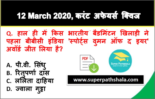 | Q1. | हाल ही में किस भारतीय बैडमिंटन खिलाड़ी ने पहला बीबीसी इंडिया 'स्पोर्ट्स वुमन ऑफ द इयर' अवॉर्ड जीत लिया है? |