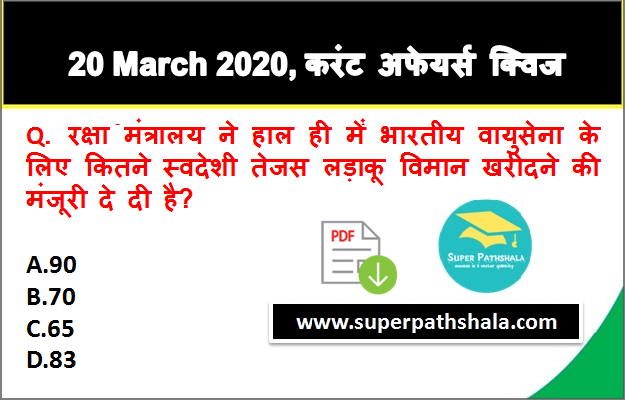 Ans: 83 विवरण: यह फैसला रक्षा मंत्री राजनाथ सिंह के नेतृत्व में रक्षा अधिग्रहण परिषद (डीएसी) ने लिया है. यह अब प्रस्ताव मंजूरी के लिए सुरक्षा मामलों की कैबिनेट कमेटी के सामने रखा जाएगा. तेजस एक हल्का लड़ाकू विमान है, जिसे हिंदुस्तान एरोनोटिक्स लिमिटेड (HAL) ने तैयार किया है. विमान का आधिकारिक नाम तेजस 04 मई 2003 को तत्कालीन प्रधानमंत्री अटल बिहारी वाजपेयी ने रखा था. इस खरीद से 'मेक इन इंडिया' को बढ़ावा मिलेगा क्योंमकि विमान का डिजाइन और विकास स्वआदेशी तकनीक से किया गया है. |