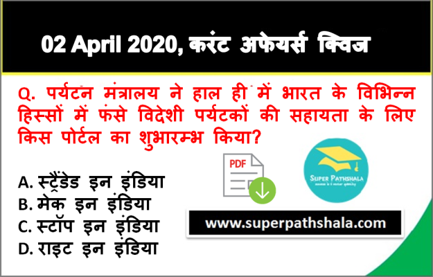 | Q1. | पर्यटन मंत्रालय ने हाल ही में भारत के विभिन्न हिस्सों में फंसे विदेशी पर्यटकों की सहायता के लिए किस पोर्टल का शुभारम्भ किया? |