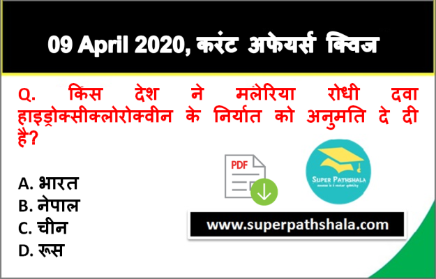 | Q9. | किस देश ने मलेरिया रोधी दवा हाइड्रोक्सीक्लोरोक्वीन के निर्यात को अनुमति दे दी है? |