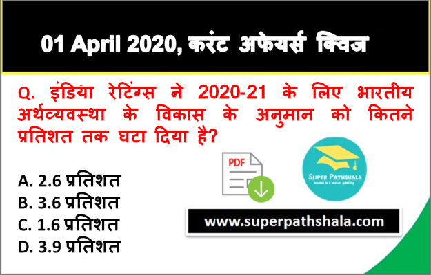 Ans: 3.6 प्रतिशत विवरण: इंडिया रेटिंग्स ने भी अगले वित्त वर्ष के लिए आर्थिक वृद्धि दर के अनुमान को कम कर 3.6 प्रतिशत कर दिया है. एजेंसी के अनुसार वृद्धि का अनुमान कम करने का कारण निजी खपत में कमी तथा निवेश में गिरावट है. हालांकि, शुद्ध रूप से निर्यात योगदान अधिक होने और उच्च सरकारी खपत से कोरोना वायरस के अर्थव्यवस्था पर पड़ने वाले प्रभाव को कम करने में मदद मिलनी चाहिए. भारत में कोरोना वायरस महामारी के प्रसार को देखते हुए अनुमान के और नीचे आने का जोखिम है. स्टैंडर्ड एंड पुअर्स ने 2020-21 के लिए भारत की जीडीपी वृद्धि दर का अनुमान 6.5 प्रतिशत से घटाकर 5.2 प्रतिशत कर दिया था. |