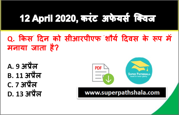 Ans: 9 अप्रैल विवरण: केंद्रीय रिजर्व पुलिस बल का वीरता दिवस 9 अप्रैल 1965 को पाकिस्तानी सैनिकों से लड़ते हुए अपने प्राण न्यौछावर करने वाले वीर पुरुषों को श्रद्धांजलि देने के लिए पूरे भारत में हर साल 9 अप्रैल को मनाया जाता है। इस दिन को 'सीआरपीएफ शौर्य दिवस' के रूप में भी जाना जाता है। सीआरपीएफ का गठन 1939 में क्राउन की प्रतिनिधि पुलिस के रूप में हुआ था। सीआरपीएफ गृह मंत्रालय और इसके आदर्श वाक्य "सेवा और वफादारी"के तहत कार्य करता है। |