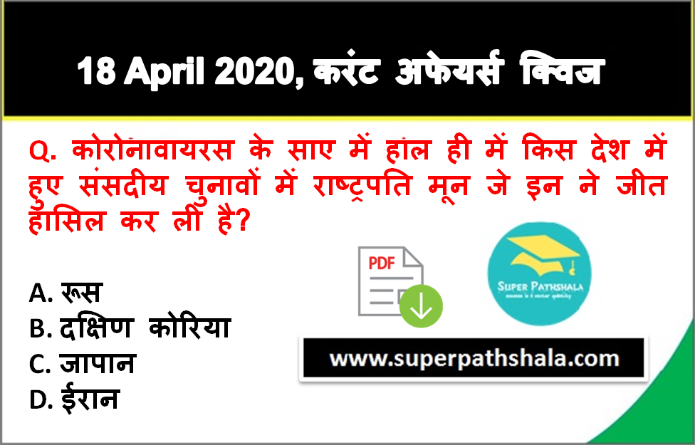 | Q4. | कोरोनावायरस के साए में हाल ही में किस देश में हुए संसदीय चुनावों में राष्ट्रपति मून जे इन ने जीत हासिल कर ली है? |